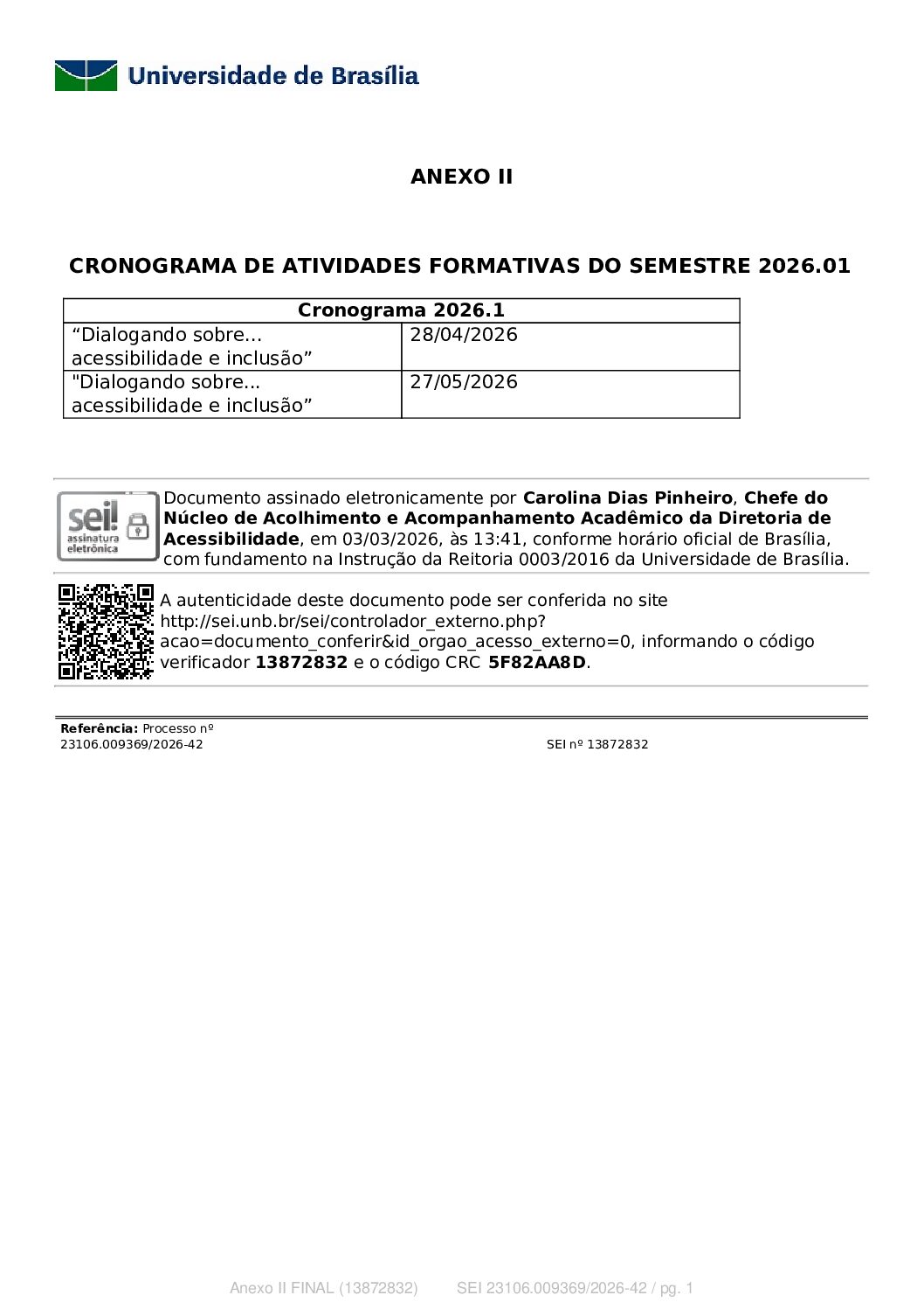 ANEXO I – CRONOGRAMA DO SEMESTRE 2026.1