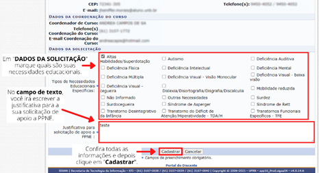 Em “DADOS DA SOLICITAÇÃO” você irá marcar quais são suas necessidades educacionais e, abaixo, no campo de texto, você irá escrever a justificativa para a sua solicitação de apoio à DACES. Antecipe informações sobre suas demandas de acessibilidade e as barreiras que você enfrenta no processo de aprendizagem.